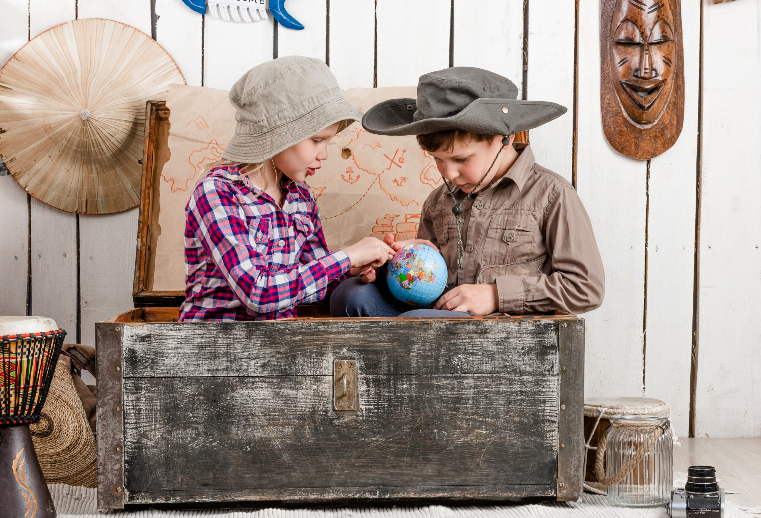 little boy and girl study globe in big chest