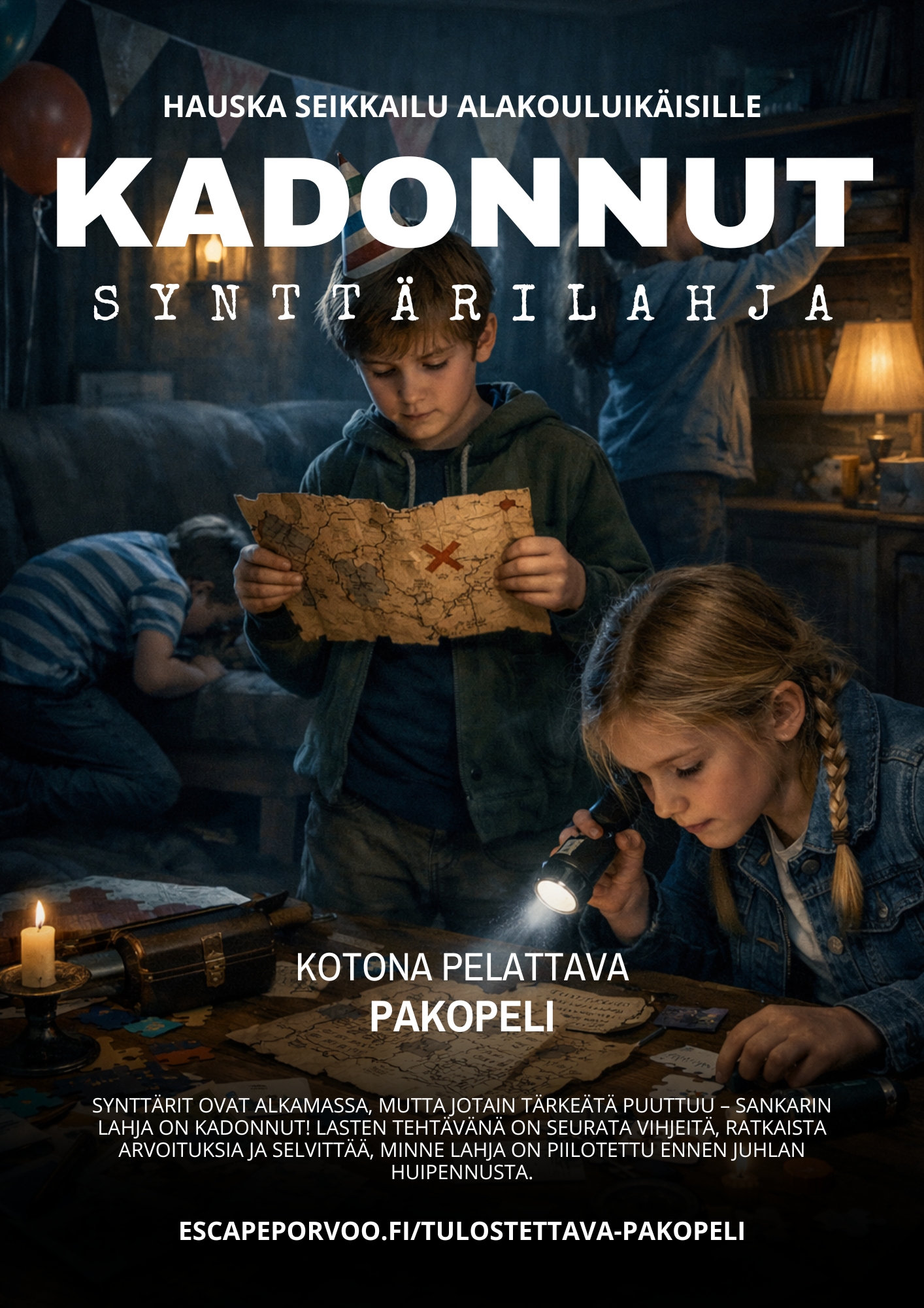 printattava pakopeli, pakopeli kotiin, tekemistä lasten synttäreille, lasten synttärit ohjelma, synttärit ohjelma, ohjelmaa lastenjuhliin, pakopeli, escaperoom, escapeporvoo, Kadonnut synttärilahja, pysty